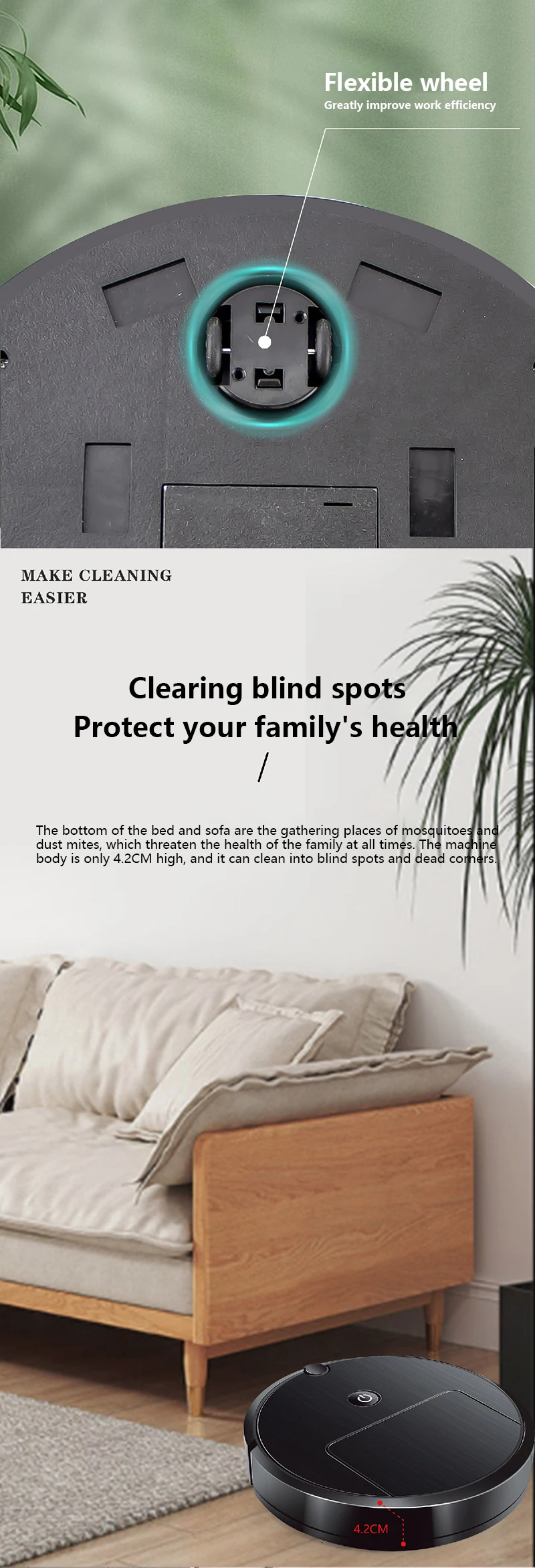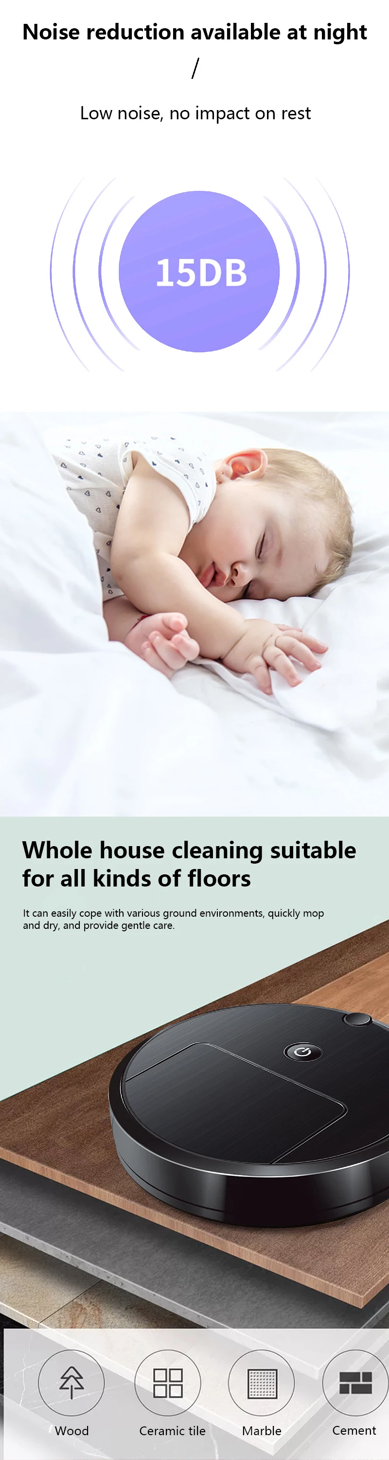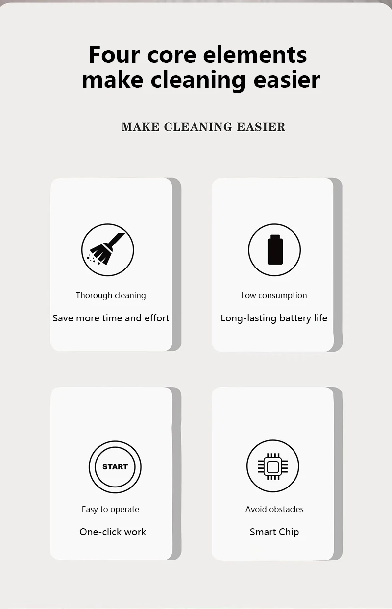 4. Quiet Operation: Our robotic vacuum and mop combo operates at a low noise level, allowing it to clean quietly without disturbing your rest, work, or daily activities.